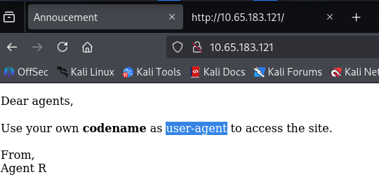 [!note] Had to get a hint and realised user-agent can be amended via firefox so used claude to help on how to change user-agent - noticed agent at bottom was named agent R so they use first letter of name only so logically I would ahve to go to A then B and then got the answer at C