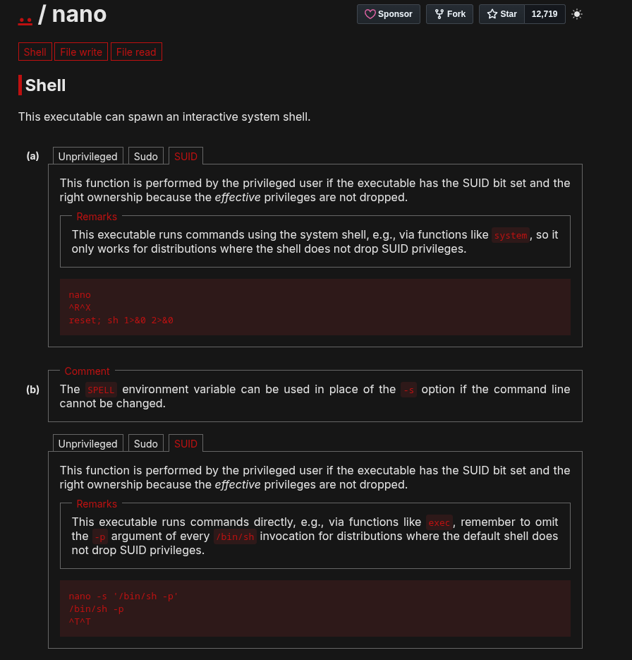 [!note] Using sudo -l took me nowhere then tried SUID bit binary and saw that nano has SUIT bit binary set: