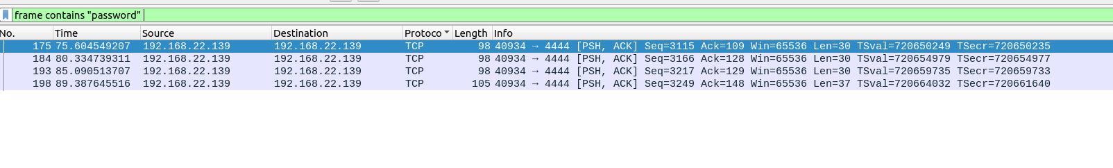 [!note] Did basic check for http traffic etc. and couldn’t find anything so decided to look for keyword string like ‘password’ using: frame contains “password” in the search filter and got the following: