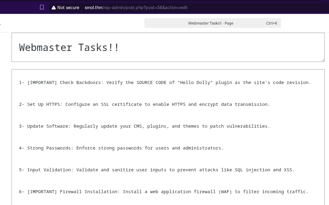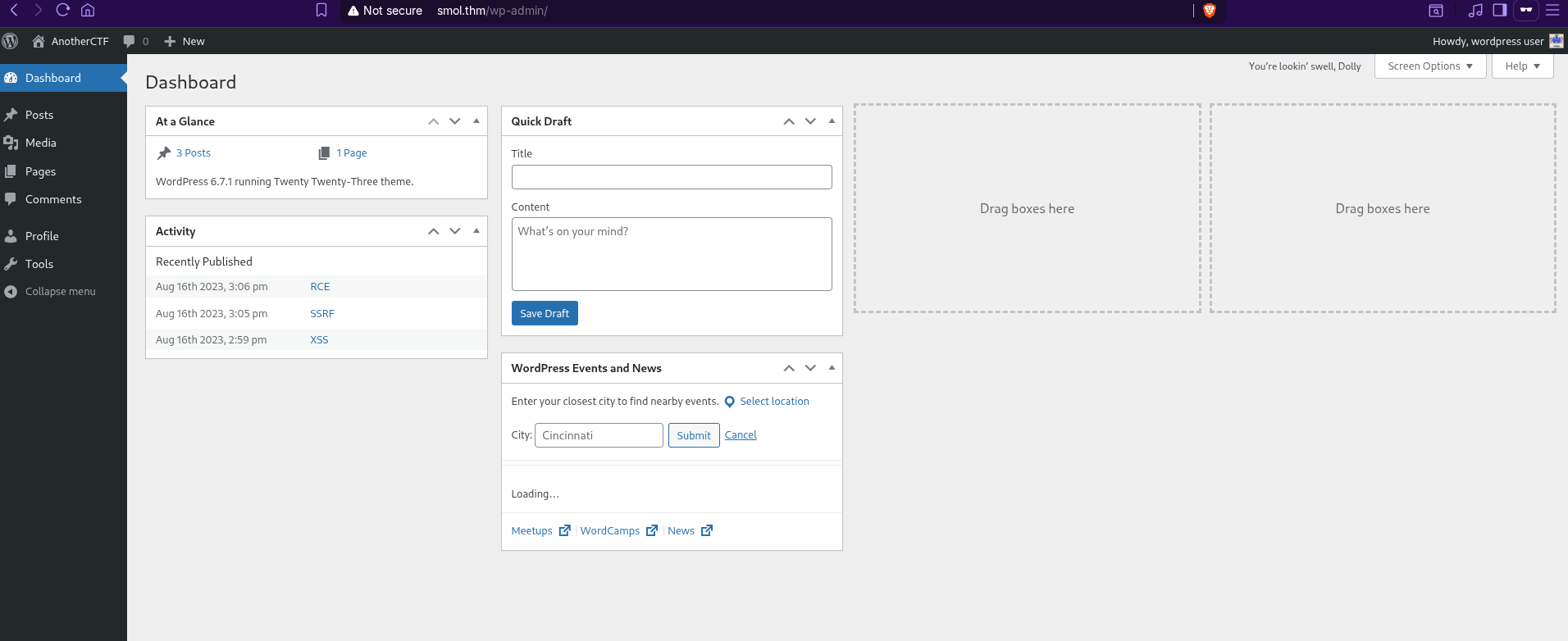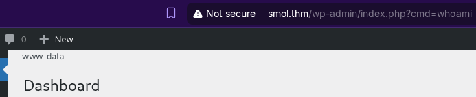 [!note] Ok interesting I think - the wp-admin page changed the URL into http://www.smol.thm/wp-login.php?redirect_to=http%3A%2F%2Fwww.smol.thm%2Fwp-admin%2F&reauth=1